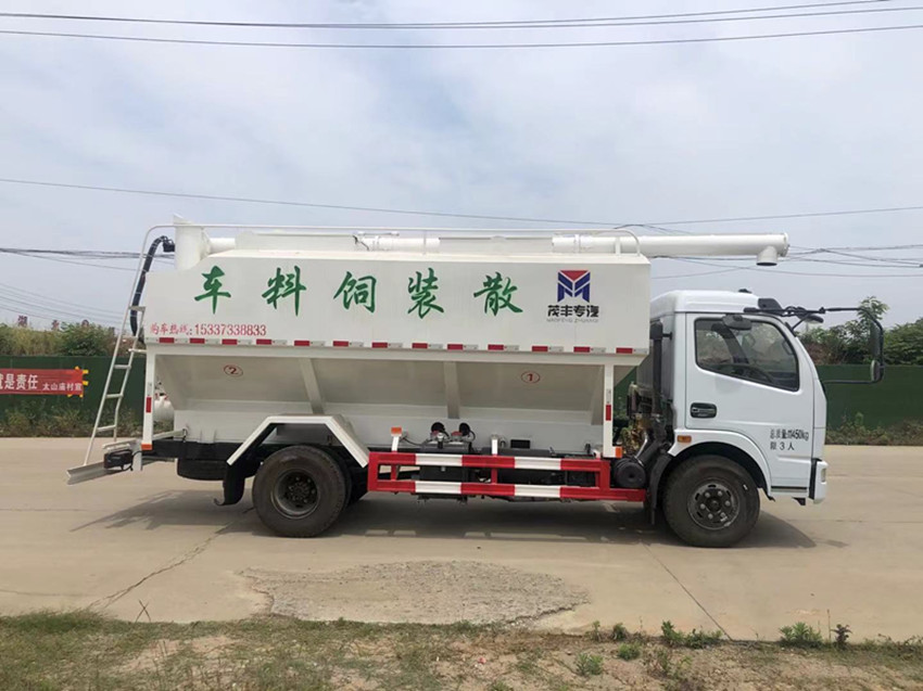 散裝飼料運輸車,散裝飼料車的飼料罐架設在卡車的底盤上,罐頂開有進料口.頂部的一根螺旋輸送卸料管(俗稱卸料絞龍)則可自由回轉(zhuǎn)和抬升,抬升的仰角可達60度。運輸時,頂部的螺旋管平臥在罐頂;卸料時則抬起,使管端的出料口與畜禽飼養(yǎng)場貯料罐頂部的進料門相接,駕駛室內(nèi)裝有操縱裝置(操縱裝置也可裝置在罐體尾部),卸料時通過車底的動力輸出軸和減速器來驅(qū)動螺旋,以完成卸料。