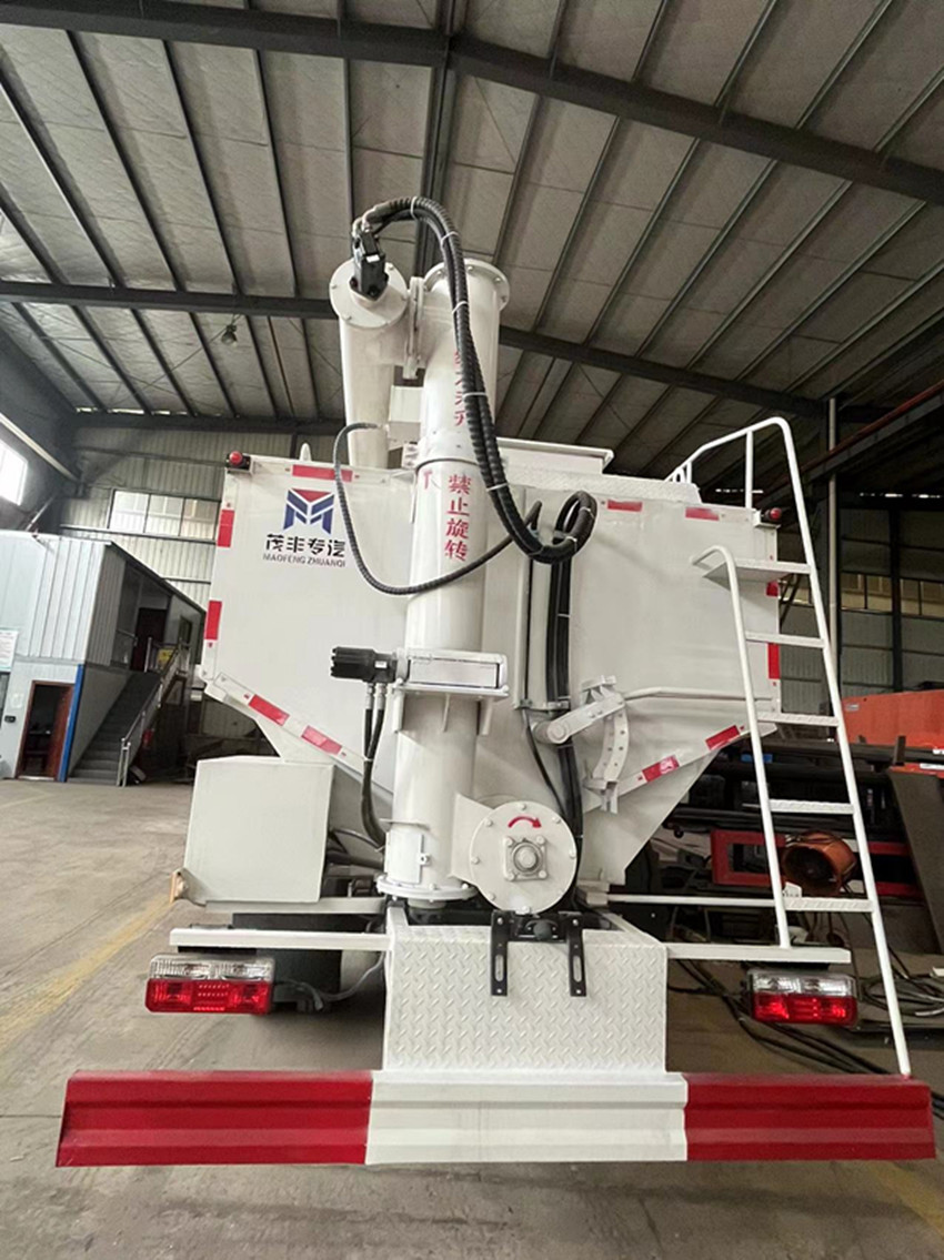 散裝飼料運輸車,散裝飼料車的飼料罐架設在卡車的底盤上,罐頂開有進料口.頂部的一根螺旋輸送卸料管(俗稱卸料絞龍)則可自由回轉(zhuǎn)和抬升,抬升的仰角可達60度。運輸時,頂部的螺旋管平臥在罐頂;卸料時則抬起,使管端的出料口與畜禽飼養(yǎng)場貯料罐頂部的進料門相接,駕駛室內(nèi)裝有操縱裝置(操縱裝置也可裝置在罐體尾部),卸料時通過車底的動力輸出軸和減速器來驅(qū)動螺旋,以完成卸料。